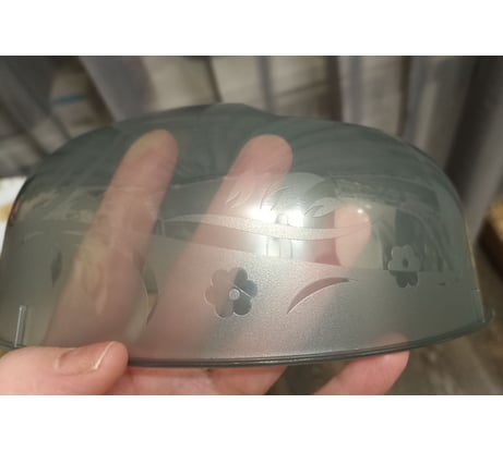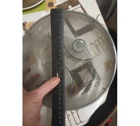 Качество пластика отличное, не мутнеет и не царапается. В эксплуатации 6 месяцев. 23 см – это диаметр по внешнему краю, внутренний получается примерно 22 см. То есть максимальный диаметр тарелки под эту крышку – 21 см, так как у тарелки имеется высота, а крыша кверху немного сужается. Это крышка для маленькой микроволновки.