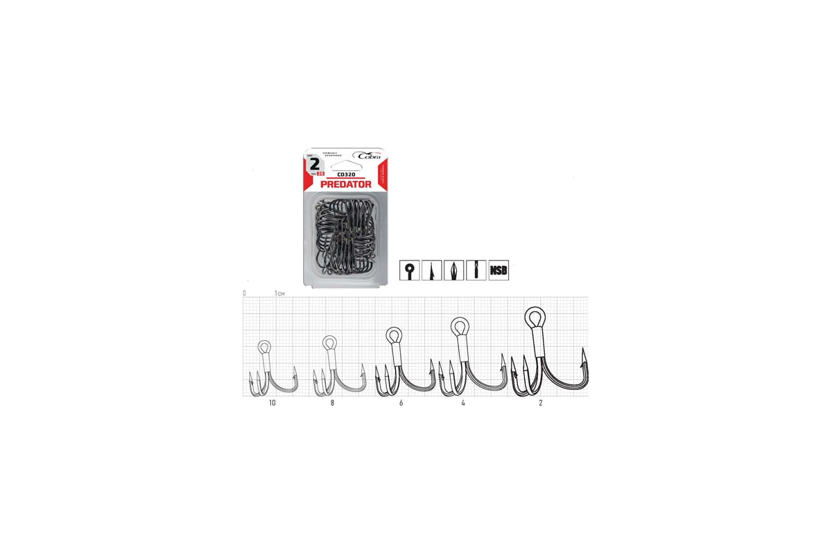 Крючки-тройники COBRA сер. CT320, разм.006, 25шт., в блистере CT320-006 со средней длиной цевья используются для оснащения большинства рыболовных оснасток и всевозможных искусственных приманок. Цвет: NSB.