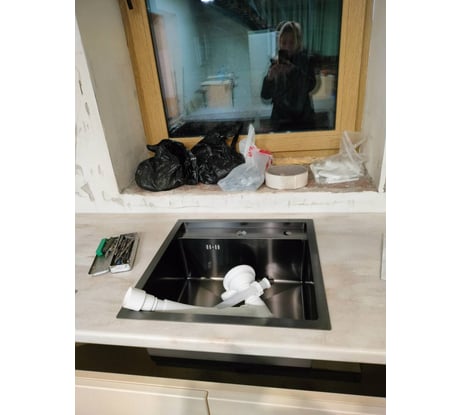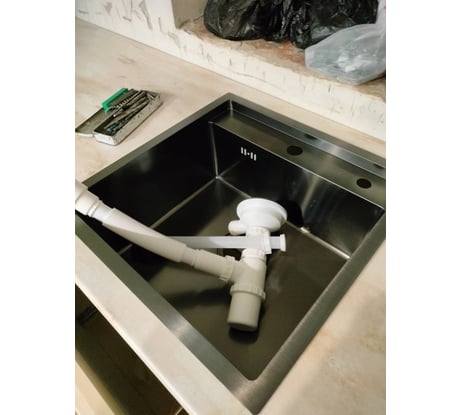 Мойка укомплектована итальянским сифоном с прямоугольным переливом WISENT GER010 и гофротрубой.