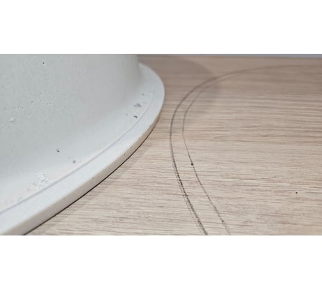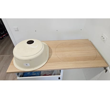 Шикарная мойка! Посмотрите как она смотрится в светлой столешнице! Глаз не нарадуется. Впервые монтировал сам мойку, и делал так, сначала обвел ее контур, потом сделал небольшой отступ на глаз, хотя мануал советует отступать поболее, НО технологические линии не дадут ее поставить вровень со столешницей, см.фото. Поэтому вырезав отверстие, дальше аккуратно подгонял его под мойку, ушло довольно много времени, но и делал неспешно, использовал лобзик и реноватор. Как подогнал, посадил на герметик, а через день, как герметик засох, изнутри промазал холодной сваркой - т.е мойка в прямом смысле заварена в столешнице. И это хорошо, учитывая что иных способов монтажа нет, как я понял. Сидит крепко, кухонный модуль можно двигать через эту мойку. Дырку под кран делал фрезой Форстнера (35мм в моем случае). Сифон брал WIRQUIN NEO.