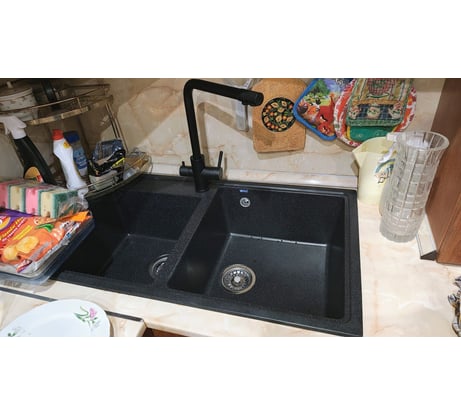 Мойка хорошая, однако, пару недостатков отмечу. Во-первых, дно у большой чаши слишком плоское, поэтому вода иногда уходит не до конца (т.е. сливное отверстие не является самой нижней точкой). Во-вторых, фурнитура очень дешевая, пробки, прокладки, гофры - все очень посредственного качества. Понятно, что мойка недорогая, однако, камень заслуживает большего.
