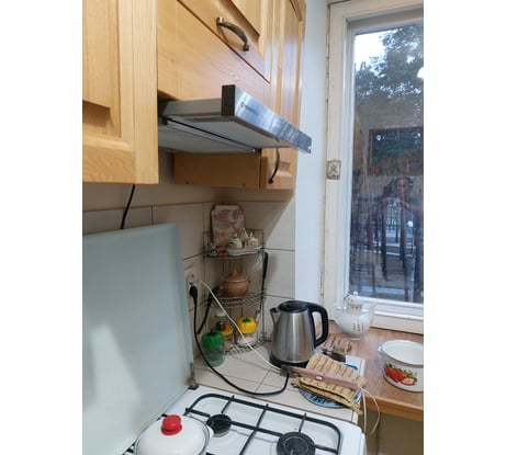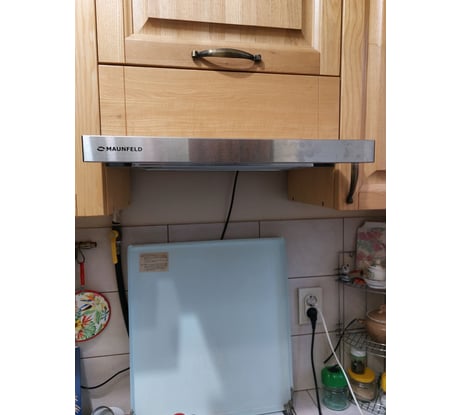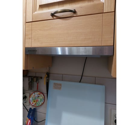 Компактная вытяжка, без проблем встроилась в кухонной полке.