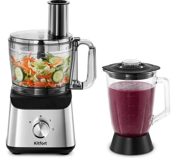 Блендер позволит приготовить протеиновые смеси и фитнес-напитки. Для блендера в комплекте предусмотрена отдельная стеклянная чаша. В крышке чаши блендера есть отверстие, закрываемое мерным колпачком, для добавления ингредиентов непосредственно во время работы. Измельчитель позволит быстро измельчить мясо, твердый сыр, овощи, травы, чеснок, ягоды и многое другое. Насадка для замеса теста позволит замешивать тесто. Насадка-терка, насадка-шинковка, насадка для картофеля фри и насадка для нарезки кубиками позволят быстро порезать и натереть овощи, фрукты и другие пищевые продукты в домашних условиях. Чаша комбайна общая для всех насадок и ножей, кроме ножей блендера. Для чаши комбайна предусмотрена пластиковая крышка с толкателем.