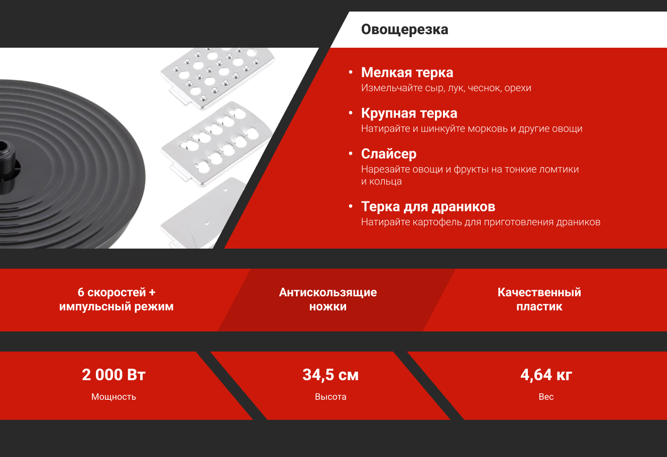 Комбайн оснащен мощным двигателем с максимальной мощностью 2000 Вт и номинальной мощностью 1500 Вт, что обеспечивает отличную производительность и надежность в работе. Благодаря шести скоростям вы сможете подбирать оптимальный режим для каждого ингредиента, а функция импульсной работы позволит добиться максимально однородной текстуры в короткие сроки.