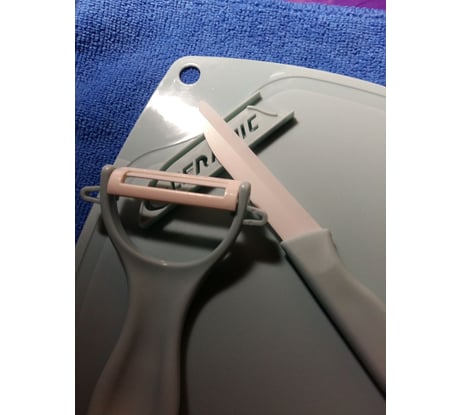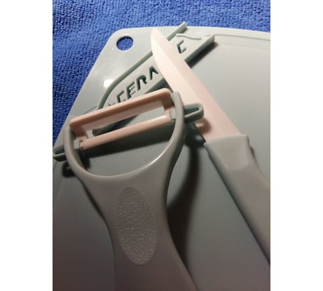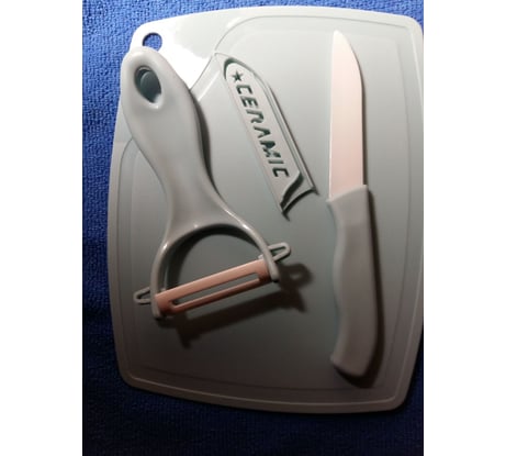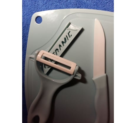 Доска только под нарезку фруктов или томатов с вытекающим соком для чего сделаны бороздки с края. Нож из цельного куска керамики и режет отлично. Овощечистка лишь со ВСТАВКОЙ из керамики, но тоже чистит вполне прилично и удобная.