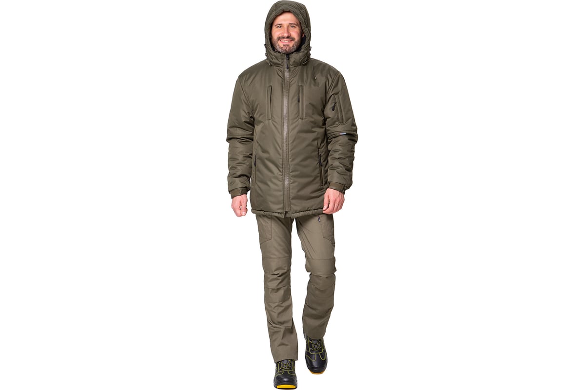 Куртка: прямого силуэта с притачной теплозащитной простёганной вертикальными строчками подкладкой, с центральной застёжкой на двухзамковую влагозащитную молнию с внутренней утеплённой ветрозащитной планкой. Верхняя часть молнии закрывается мягкой планкой из основной ткани, которая защищает подбородок от защемления и не доставляет дискомфорт при носке. Воротник-стойка утеплённый, внутренний воротник из флиса. На верхнюю часть воротника настрочены клапаны с кнопками для пристёгивания концов капюшона, это даёт возможность фиксации воротника в вертикальном положении с помощью его удлиненных краёв на кнопки без одновременного застёгивания нижней части капюшона. Рукава одношовные, низ рукава с притачной манжетой, манжета частично с эластичной тесьмой, объём дополнительно регулируется при помощи паты с застёжкой на контактную ленту. Низ куртки регулируется по объёму при помощи шнура и фиксаторов в боковых швах.