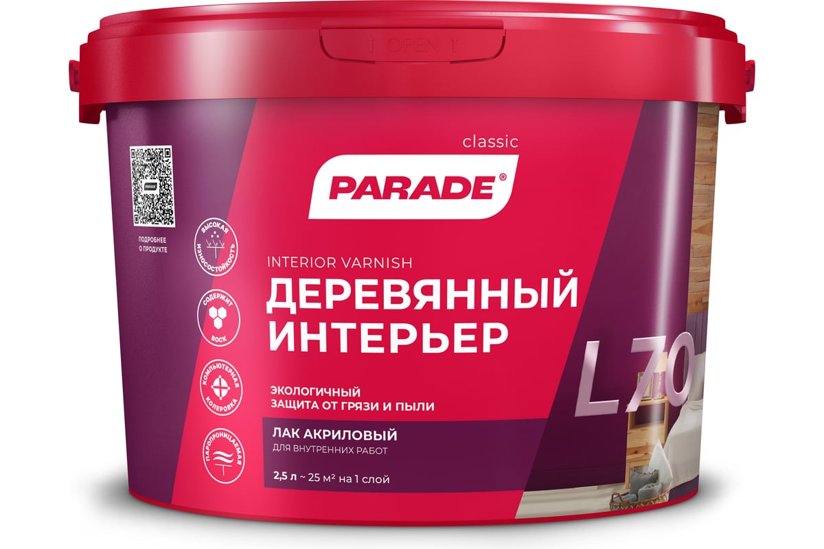 Лак акриловый полуматовый PARADE L70 Деревянный интерьер 2,5 л Россия Лк-00010341