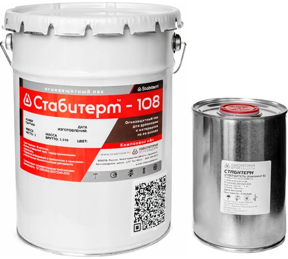 Лак эпоксидный для древесины и материалов на ее основе Стабитерм-108 — двухкомпонентная система, состоящая из эпоксидной основы (компонент А), содержащей антипирены и функциональные добавки, и отвердителя (компонент Б). Допускается применение колеровочной пасты для достижения цвета.