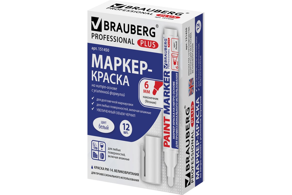 Лаковый маркер-краска BRAUBERG PRO PLUS EXTRA paint marker 6 мм, белый, нитро-основа 151450 предназначен для маркировки различных материалов в промышленных условиях.