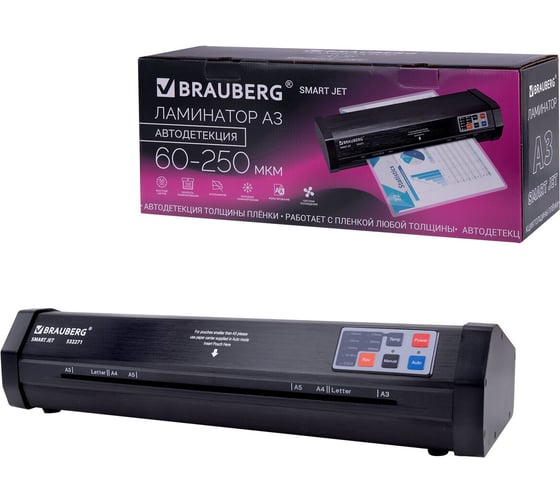 Ламинатор BRAUBERG SMART JET А3 автодетекция толщины пленки 60-250мкм,нагрев 50сек,100см/мин, 532271