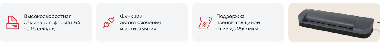 Ламинатор разогревается за 55 секунд, что экономит время.
