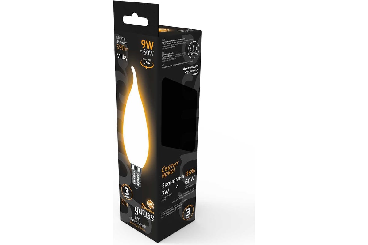 Расходные материалы для лампы Gauss Filament свеча на ветру, 9W, 590lm, 3000К, Е14, milky, LED 104201109