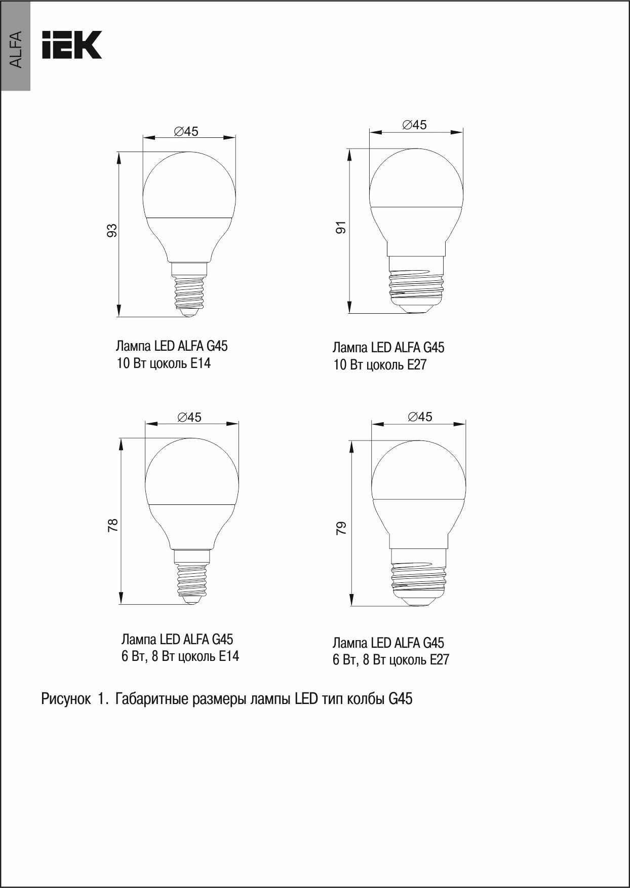 Технические характеристики IEK LED ALFA G45 шар 10Вт 230В 3000К E27 LLA-G45-10-230-30-E27