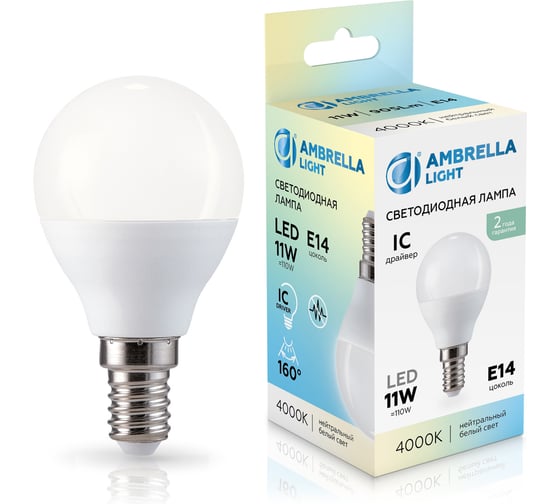 Светодиодная лампа Р45, цоколь E14, мощность 11W, IC драйвер (защищает лампу от перепадов напряжения), класс энергоэффективности А, рассеиватель белый матовый, белое свечение 4000K, форма "Шар", 45*80.
