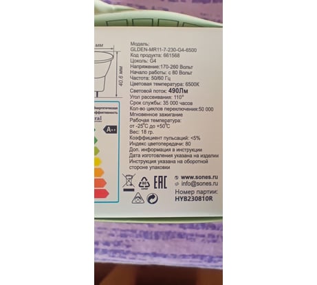 Корпус лампочки пластиковый. Ножки контактные не заостренные, как раньше были на подобных,а просто плоские:может потребоваться усилие при выставлении в цоколь. Маркировка лампочке на корпусе четкая,но слишком мелкая и длинная: сложно понять где мощность,цоколь и напряжение. На фото изображена призматический рассеиватель,но на самой лампочке пластик датированный молочный, за которым указывается жёлтые точки светодиодов,расположенные по окружности.