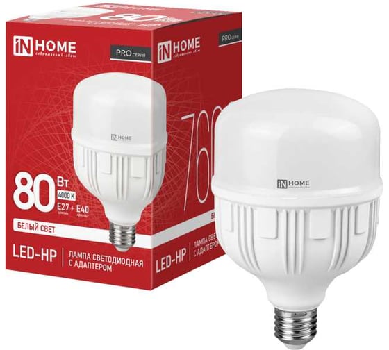 Лампа светодиодная IN HOME LED-HP-PRO 80Вт 230В E27 с адаптером Е40 4000К 7600Лм 4690612066905