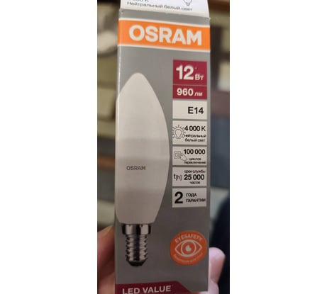 Лампа Osram серии LED Value выполнена в форме колбы В ("свеча") с цоколем E14. Материал колбы - пластик, исполнение - матовое. Световой поток 960 люмен, что соответствует лампе накаливания на 100 Вт. Такие лампы применяются для внутреннего освещения, в закрытом светильнике можно использовать и на улице.