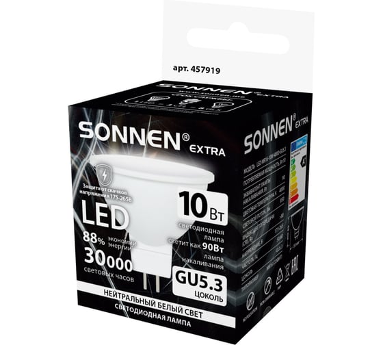 Лампа светодиодная SONNEN EXTRA 10 (90) Вт GU5.3 нейтральный белый LED GU5.3-10W-4000, 457919