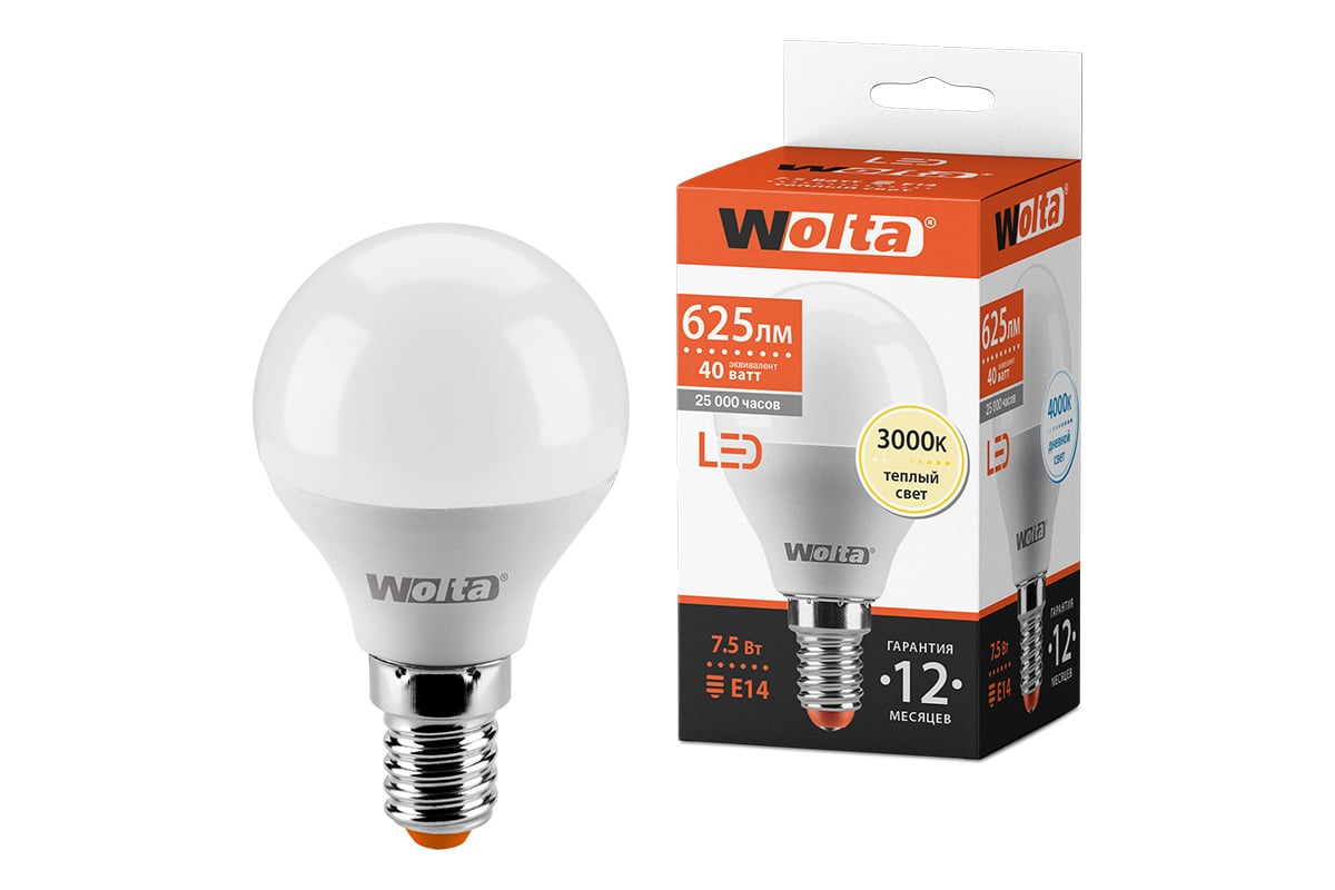 Вопросы и ответы о лампе Wolta 25Y45GL7.5E14 ШАР LED 7.5Вт, 3000K Теплый свет, цоколь E14, 625 лм