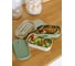 Резинка, удерживающая лотки - плотная, изначально не вызывала доверия, но за полугодовое использование понял, что это удобнее и надежнее, чем пластиковые замки. Материал на ощупь приятный, не пахучий, удобно мыть. Резинки в крышках обеспечивают очень плотное прилегание самой крышки к лотку. Есть клапаны на крышках, с их помощью можно выпустить воздух из закрытого лотка и еще плотнее закрыть крышку. Объем ланчбокса - в самый раз на добротный прием пищи для двух персон
