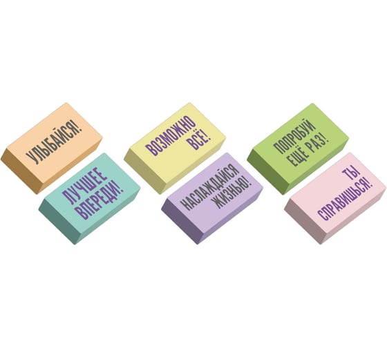 Шесть нежных пастельных оттенков в наборе радуют глаз и создают ощущение гармонии. На каждом ластике своя мотивирующая надпись, которая поддержит в учебе, работе и творчестве. Упакованы в блистерную упаковку с подвесом.