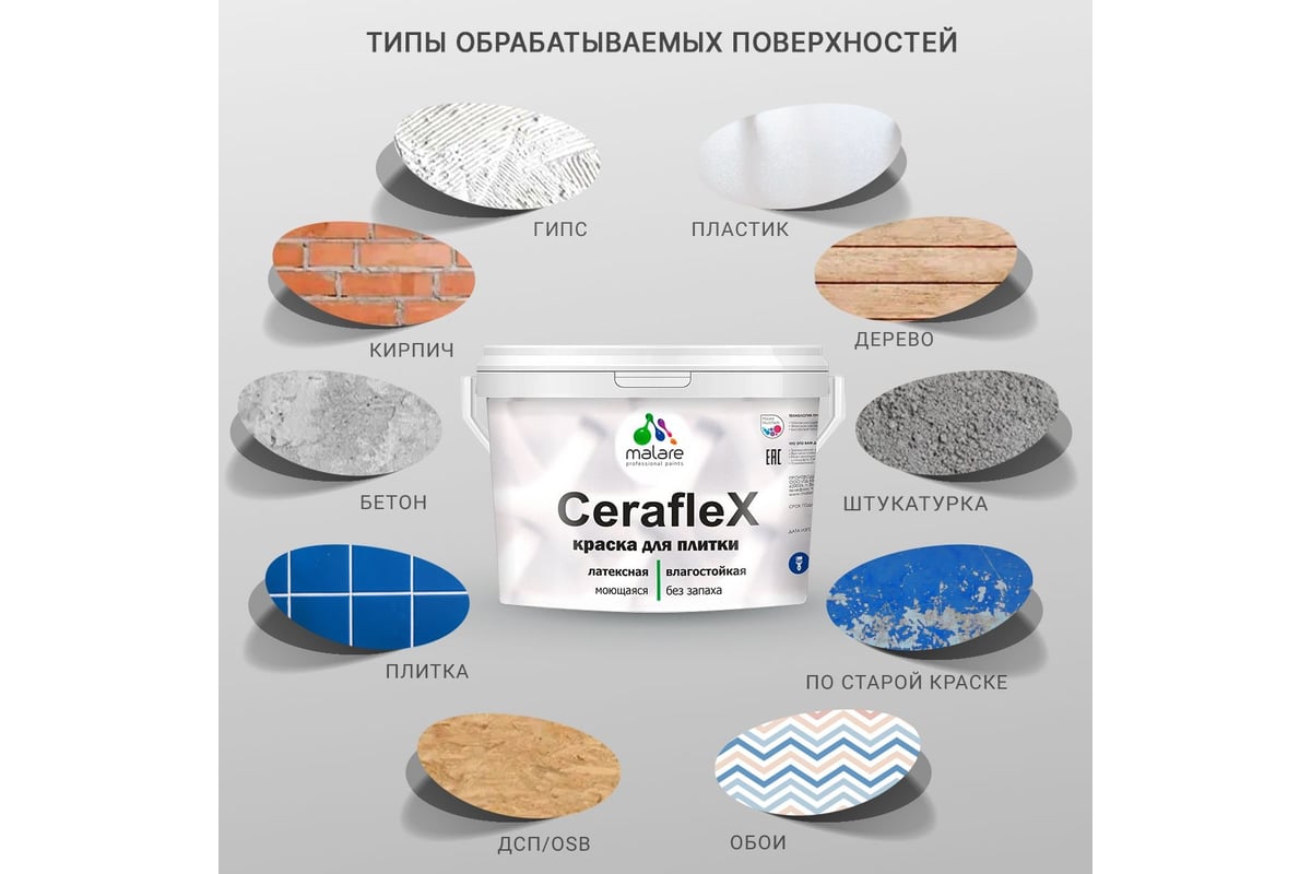 Латексная краска MALARE Ceraflex для кафельной и керамической плитки, эффект дежавю, 10 кг 2036773878032