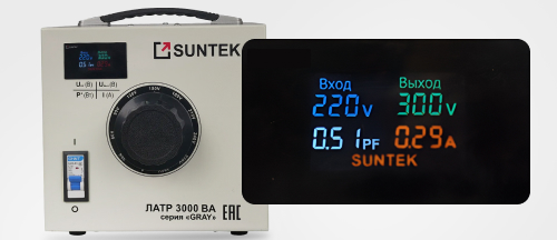 SUNTEK GRAY 3000 ВА — лабораторный автотрансформатор для плавной регулировки напряжения от 0 до 300 В под нагрузкой без обрыва цепи.
