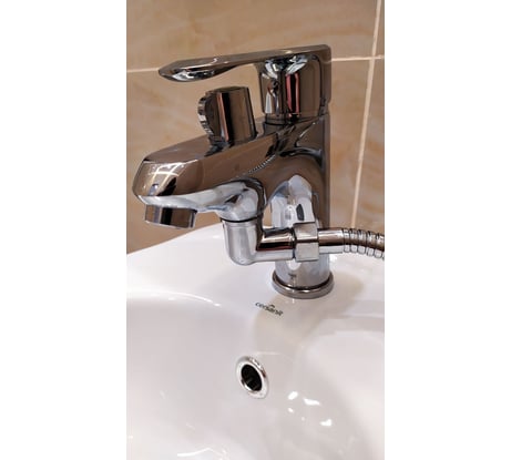 Установил на смеситель для отвода душевого шланга, не выделяется, выглядит просто как часть смесителя.