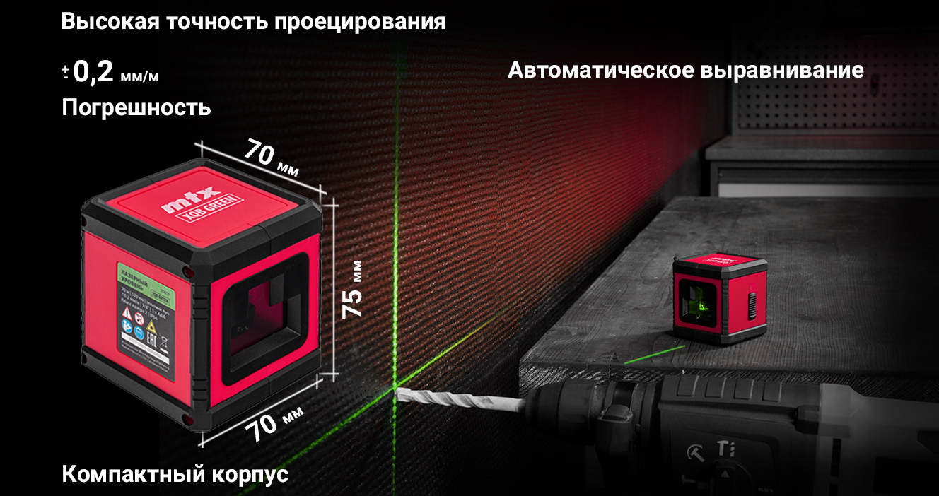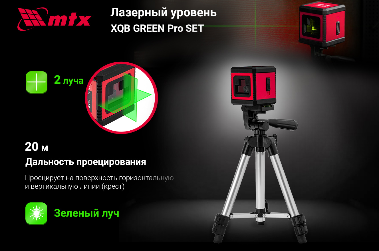 Лазерный уровень MTX xqb green pro set, 20 м, зеленый луч, батарейки, штатив 350195