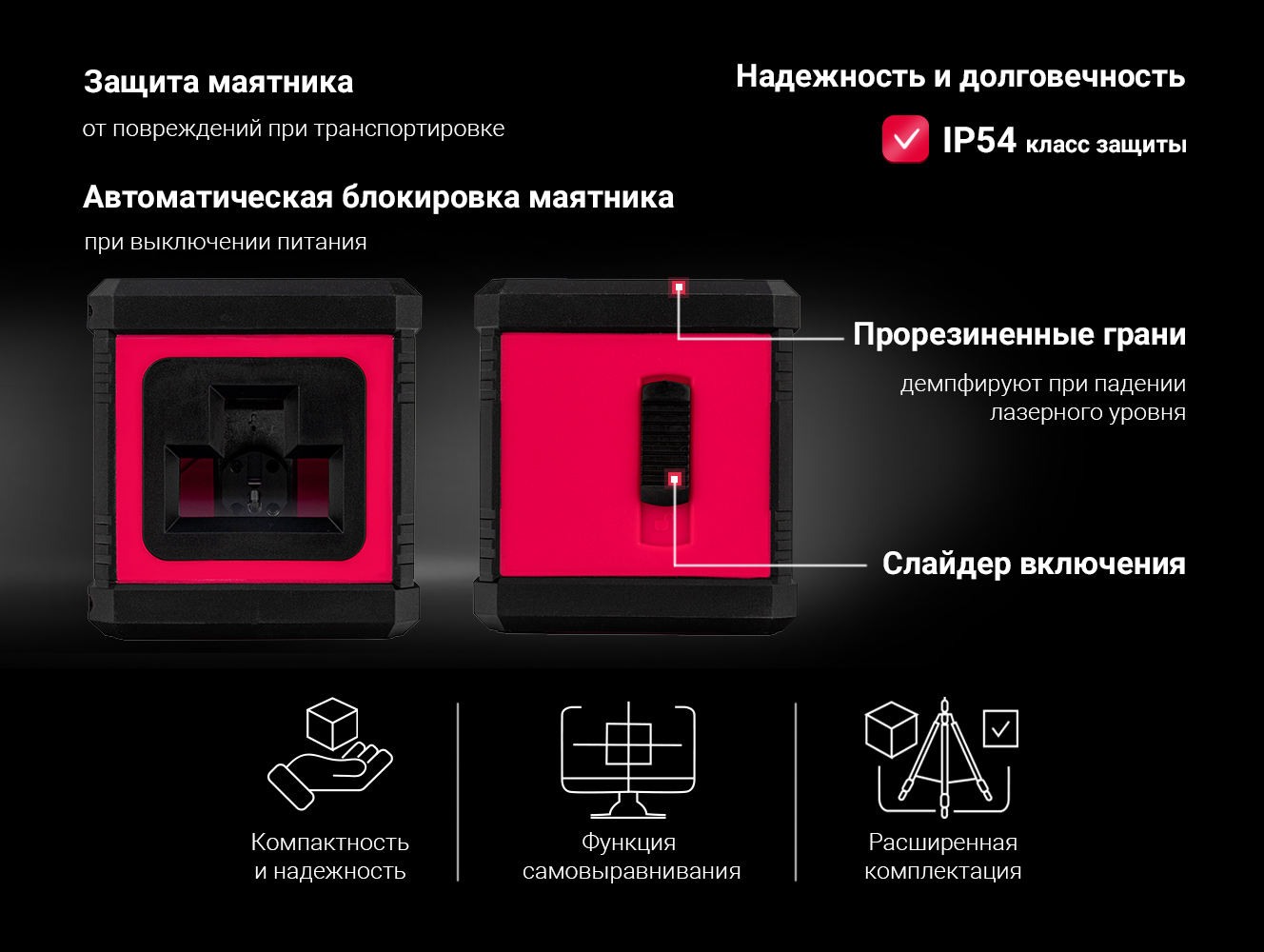 - Надежность и долговечность — корпус дополнен специальными прорезиненными гранями, демпфирующими при падении лазерного уровня