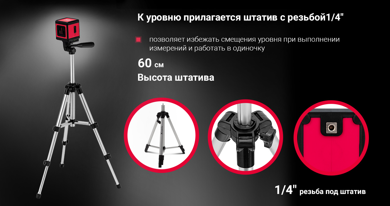 - Широкая комплектация — к уровню прилагается штатив 1/4″, позволяющий избежать его смещения при выполнении измерений и работать в одиночку