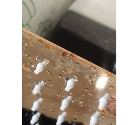 Очаговая коррозия. На торце лейки видны дефекты покрытия которое корродирует. С верхней стороны лейки появилось 5 очагов коррозии диаметром 6 мм. Из дюз вываливается ржавчина. Нижняя сторона с дюзами пока без очагов коррозии, но ржавчина "натекает" с торцов