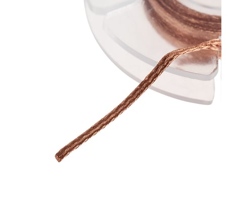Лента REXANT 09-3002 предназначена для удаления припоя при выпаивании радиокомпонентов. Представляет собой оплётку из тонкой медной проволоки, покрытой специальным флюсом. Диаметр проволоки — 1.5 мм. Длина проволоки 1.5 м. Оплетка прикладывается к расплавленному припою, паяльник должен при этом находиться в области пайки, далее оплетка насыщается излишками припоя. После чего эта часть ленты отрезается.