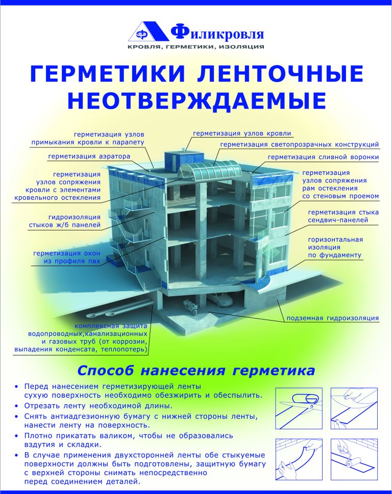 Применяется для герметизации стыков в полносборном гражданском и промышленном строительстве, а также щелей при установке оконных блоков. Может использоваться для герметизации швов, стыков, трещин жестяных и шиферных кровель и в других ремонтных работах.