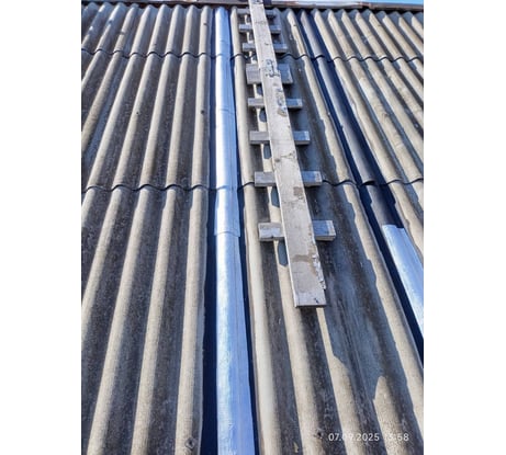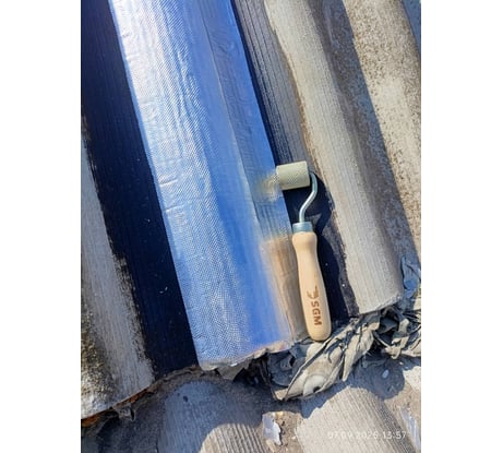 Понравилось работать этой лентой. Зачистил щеткой шифер, покрасил битумным лаком и поклеил.