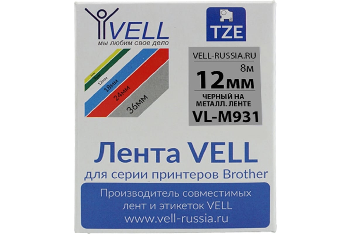 Лента Vell VL-M931 Brother TZE-M931, 12 мм, черный на металлизированном 320018 отлично подойдет для маркировки продукции, при инвентаризации или монтаже оборудования. После нанесения, создает эффект "железной таблички".