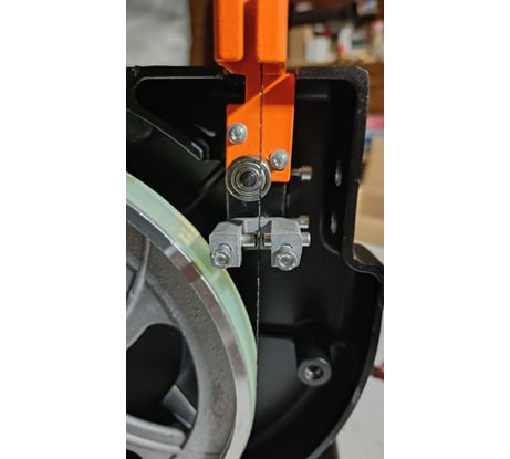 5) Боковые ограничители пильного полотна и там и там штифты (в сравнении с подшипниками эффективность/практичность вопрос спорный), задний опорный ограничитель - подшипник. А вот весь направляющий регулируемый по высоте металлический узел Giant прочнее и "прямее", чем алюминиевый у конкурента. При изменении положения направляющего узла по высоте у Giant узел не гуляет, нигде не трёт пильное полотно, ходит вертикально и фиксируется зажимным барашком намертво. У конкурента, при изменении высоты узла, то трёт, то не трёт пилку, да и болтается узел с заметно бОльшим люфтом, пока успешно не зафиксируешь.