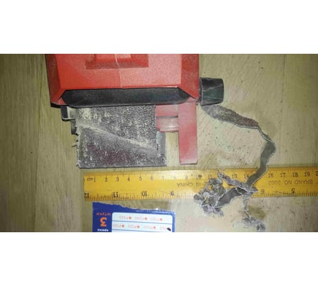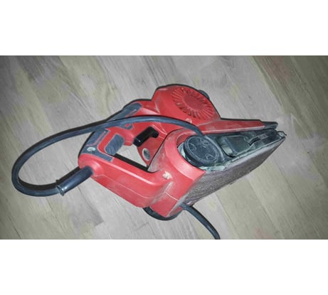 Минусы - плохая балансировка: заваливается влево - получаются борозды (фото 1), плюс повышенный износ ленты слева. К концу 2-го дня в подошве образовалась выемка 3 мм шириной и 1 мм глубиной (фото 2). При движении от себя при работе на максимальной скорости "козлит"- резко задирает "нос", и более тяжёлый "зад" моментально выедает ямку(фото 3), поэтому при работе нужно немного приподнимать "зад" одной рукой и давиить на "нос" другой. Если убавить скорость с 6 до 4, то более-менее можно работать. О работе одной рукой, даже кратковременно, не может идти и речи. Передний металлический ролик шириной всего 60 мм и подрезает кромку ленты (фото 4). Лента при работе гуляет от положения, настроенного на холостом ходу, поэтому заслонку при работе лучше держать открытой, чтобы постоянно следить за лентой (при сползании ленты от неё отрывает кромку шириной 3-10 мм или загибает кромку ленты вовнутрь ленты). Шнур смотрит вниз, при работе постоянно норовит попасть под ленту (что и произошло на 2-й день работы (фото 5), в итоге короткое замыкание. Часть повреждённого провода вырезал, концы запаял). Брал для обновления паркета (14 квадратов за 2 дня, 3 прохода лентами 40,80,120. Ленты разных марок, потому не в лентах проблема точно).