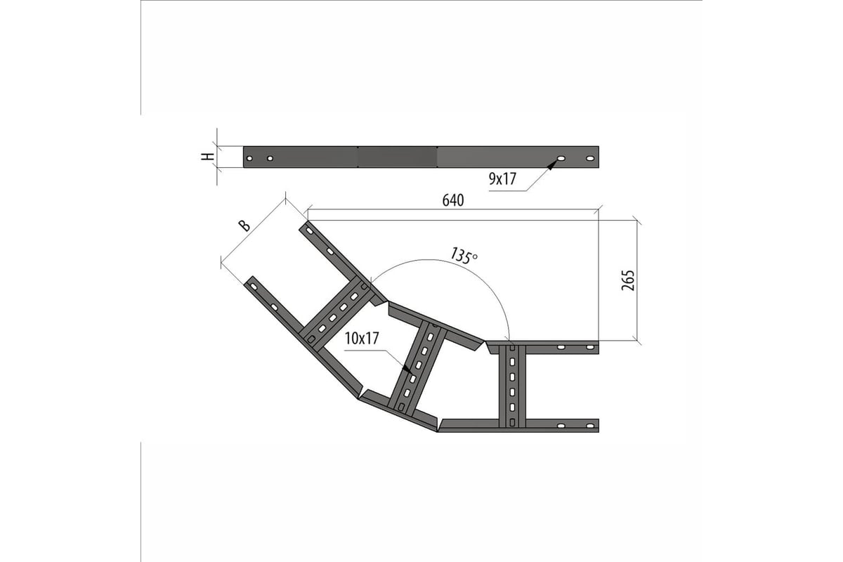 Горизонтальный лестничный угол 45 градусов позволяет выполнить поворот силовых и слаботочных линий в горизонтальной плоскости объекта. Секция подходит для соединения c металлическим лестничным лотком шириной 150 мм и высотой борта 80 мм.