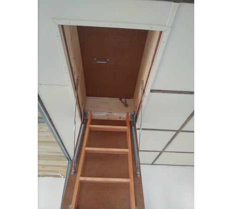 Все по дключ, вырезал проем и поставил. Потом подпилил лестницу по нужной высоте. Смонтировали с сыном за пол дня. Всякие приспособления для монтажа не использовали. Прикрутили две планки и подложили куски имитации для зазора под чистовую отделку и прикрутили к лагам через небольшие проставки. Если что, замок и ключ для открывания в комплекте, монтажных приспособлений нет.