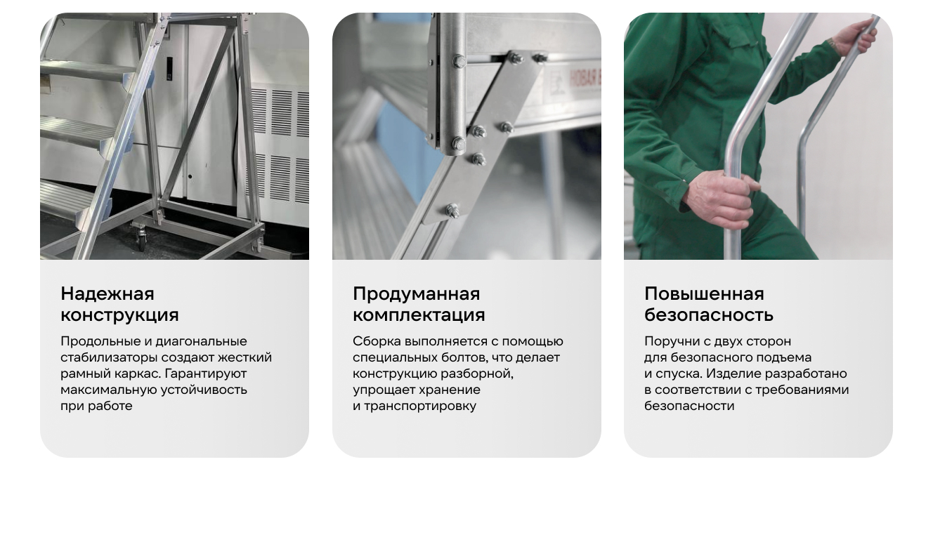 Безопасно: прочная конструкция с широкими ступенями и большой рабочей площадкой