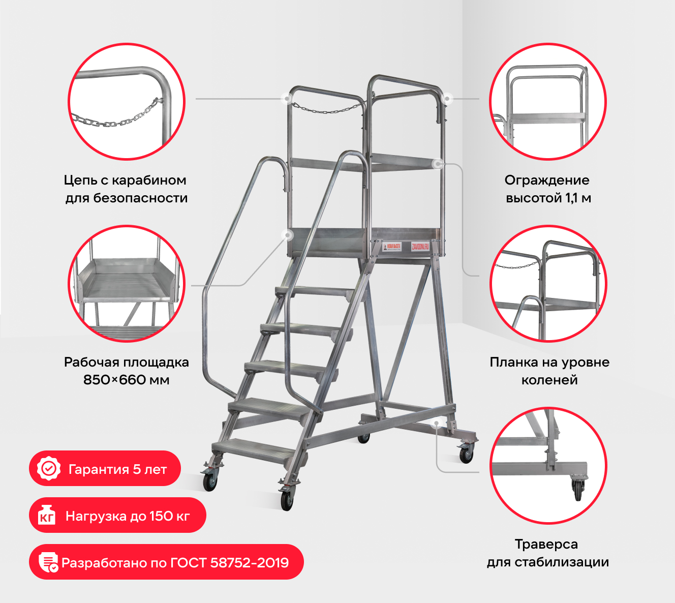 Безопасно: прочная конструкция с широкими ступенями и большой рабочей площадкой