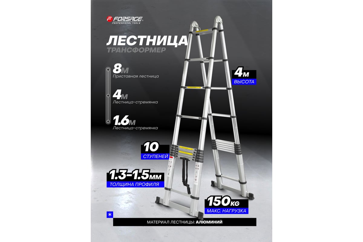 Телескопическая двухсекционная лестница Forsage — это надежный инструмент для работы на высоте, который сочетает в себе легкость, прочность и безопасность. Она станет отличным помощником в выполнении домашних и профессиональных задач!