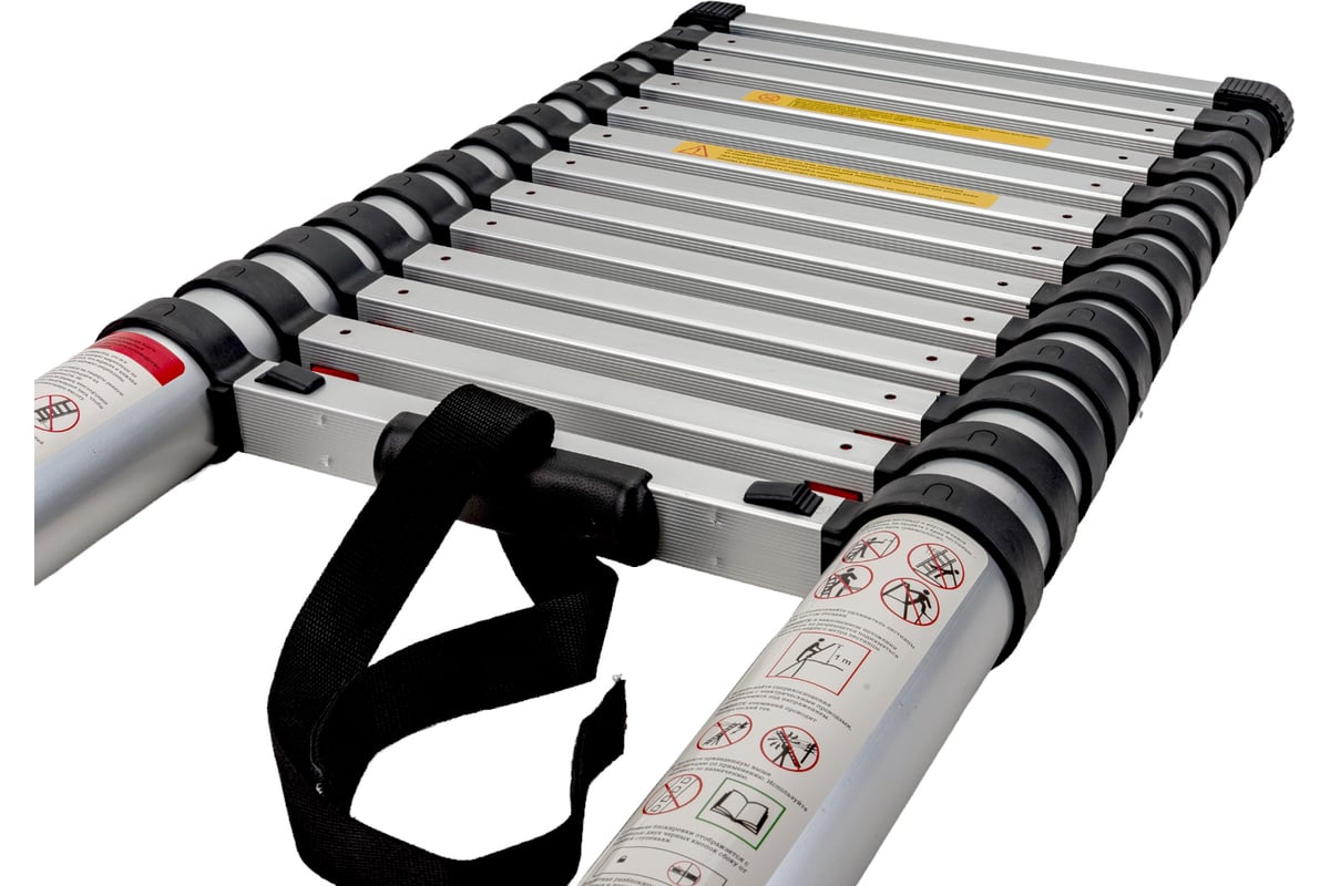 Относительно легкая телескопическая лестница для своей длины. Под весом тела в 80 кг ещё спокойно, если поднимаешься по ней с дополнительным грузом в 20 кг, то тут уже на пределе - плавные и аккуратные движения