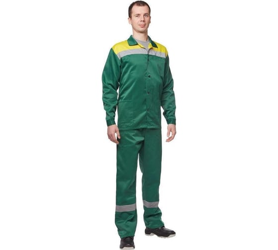 Летний костюм ООО Комус л02-КБР зеленый/желтый, р. 44-46/170-176 395772 состоит из куртки и брюк.