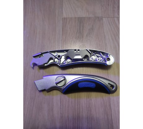 Покупал отдельно нож ( Зубр. Состоящий из двух металлических деталей. Надёжный и удобный ) Лезвия подошли идеально. Люфтов нет. Запасные уместились внутри рукояти.