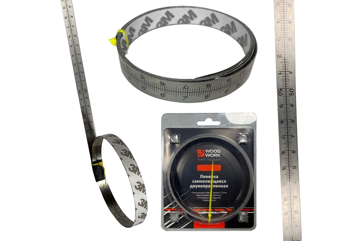 Линейка самоклеящаяся 1.5 м с двунаправленной шкалой WOODWORK RUL-15G устойчива к коррозии и истиранию, изготовлена из нержавеющей стали, имеет прочный клеевой слой.
