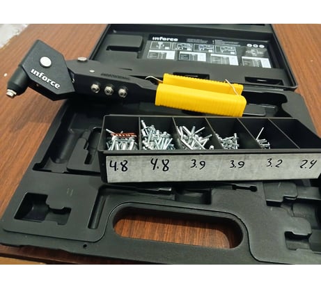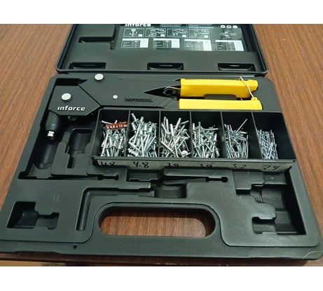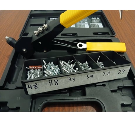 - Практичное хранение Заклепочник поставляется в удобном кейсе с отсеками для крепежа
