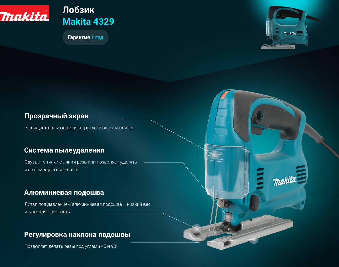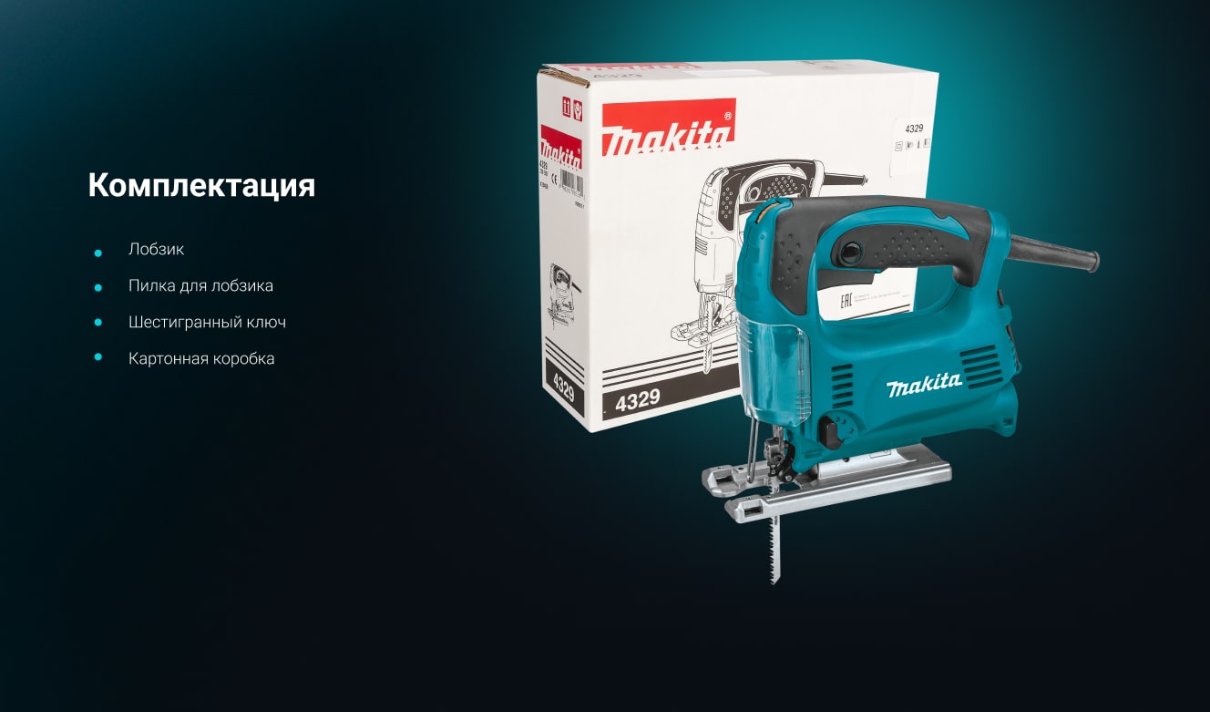 Лобзик Makita 4329 K предназначен для прямолинейного распила заготовок из древесины, пластика, металла. Данная модель оснащена мощным двигателем с высоким ходом лезвия - 3100 ход/мин. Конструкция корпуса выполнена из прочного пластика. Инструмент работает с низким уровнем шума и вибрации. Предварительная установка скорости пиления и три режима маятникового хода позволяют добиться высокого результата распиловки в зависимости от выполняемой работы.