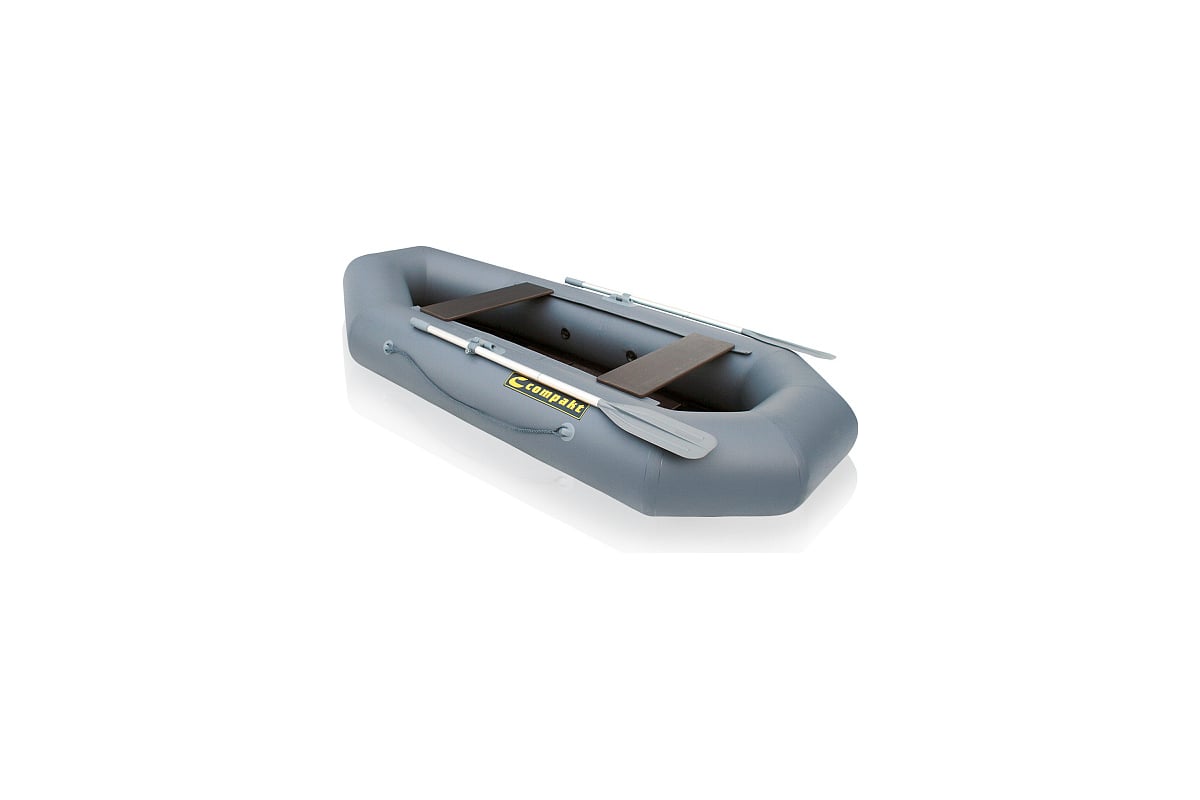 Лодка Compakt Компакт-260 натяжное дно, серый цвет 4112022 подходит для охотников и рыболовов. Рассчитана на двух пассажиров.